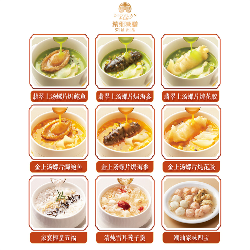 225g翡翠上湯螺片焗鮑魚x1,225g翡翠上湯螺片焗海參x1, 225g翡翠上湯螺片燉花膠x1,225g金上湯螺片焗鮑魚x1,225g金上湯螺片焗海參x1,225g金上湯螺片燉花膠x1,225g家宴椰皇五福x2,225g清燉雪耳蓮子羹x2,1000g潮汕家味四寶x1